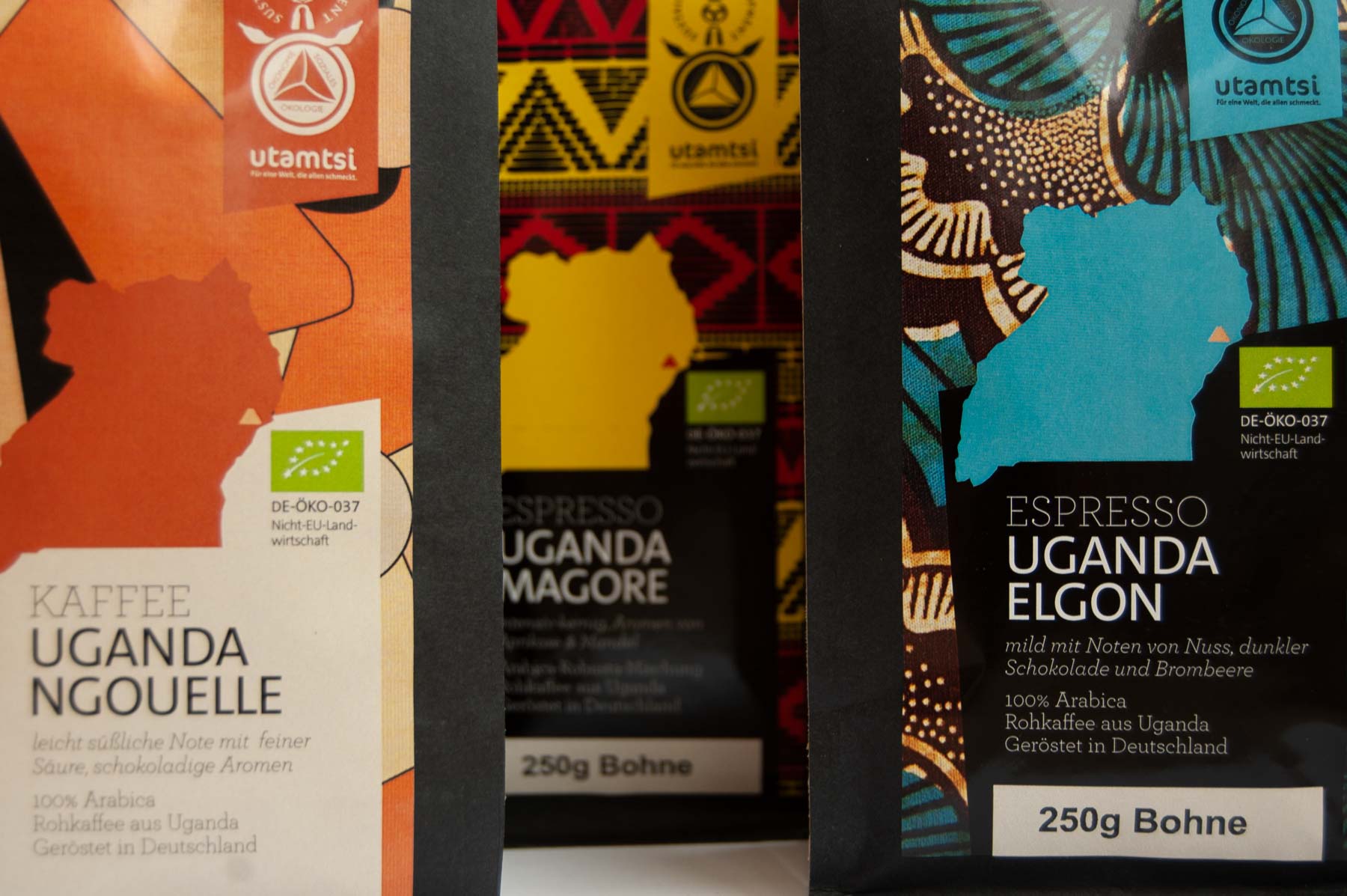 Neben Kamerun ist neuerdings auch Uganda eines der Herkunftsländer des Utamtsi-Kaffees. Rohkaffee beziehen wir unter anderem aus der im Osten Ugandas gelegenen Region um den Mount Elgon. Im Westen Ugandas arbeiten wir mit Plantagen in den bis zu 5.100 Meter hohen Rwenzori Mountains zusammen. Der Rohkaffeee aus Uganda hat unsere Röster inspiriert, drei neue Variationen zu kreieren: Espresso Uganda Elgon, Espresso Uganda Magore und Kaffee Uganda Ngouelle.